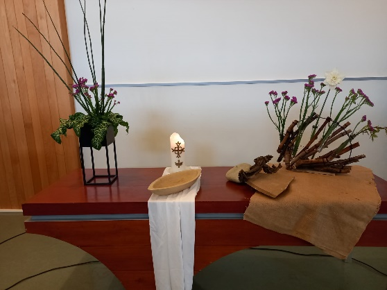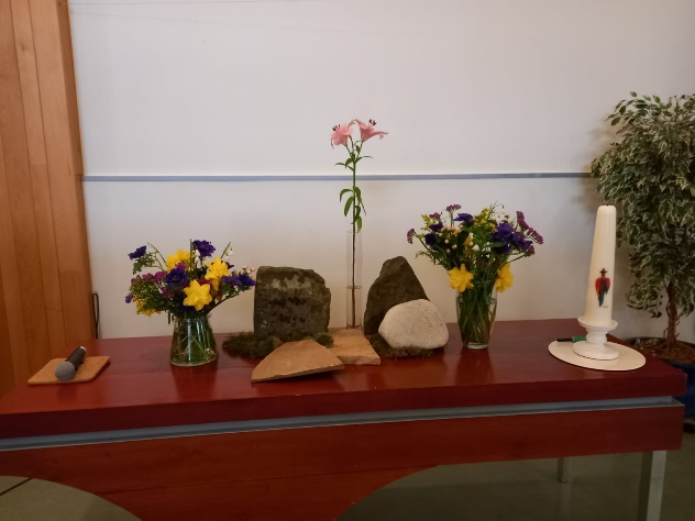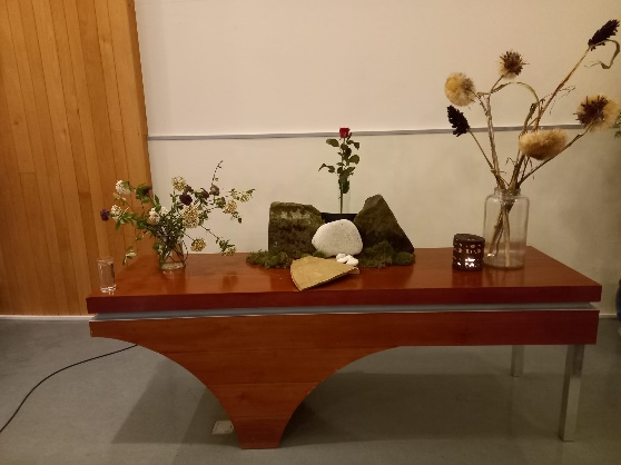 Een boodschap vertel je niet alleen met woorden, maar ook met muziek (in de prachtige muziekstukken) én met beelden (bijvoorbeeld met bloemen en stenen). Een kleine impressie van de beelden bij het lijdensverhaal, met zorg samengesteld door ons gemeentelid Gonda van der Ziel: